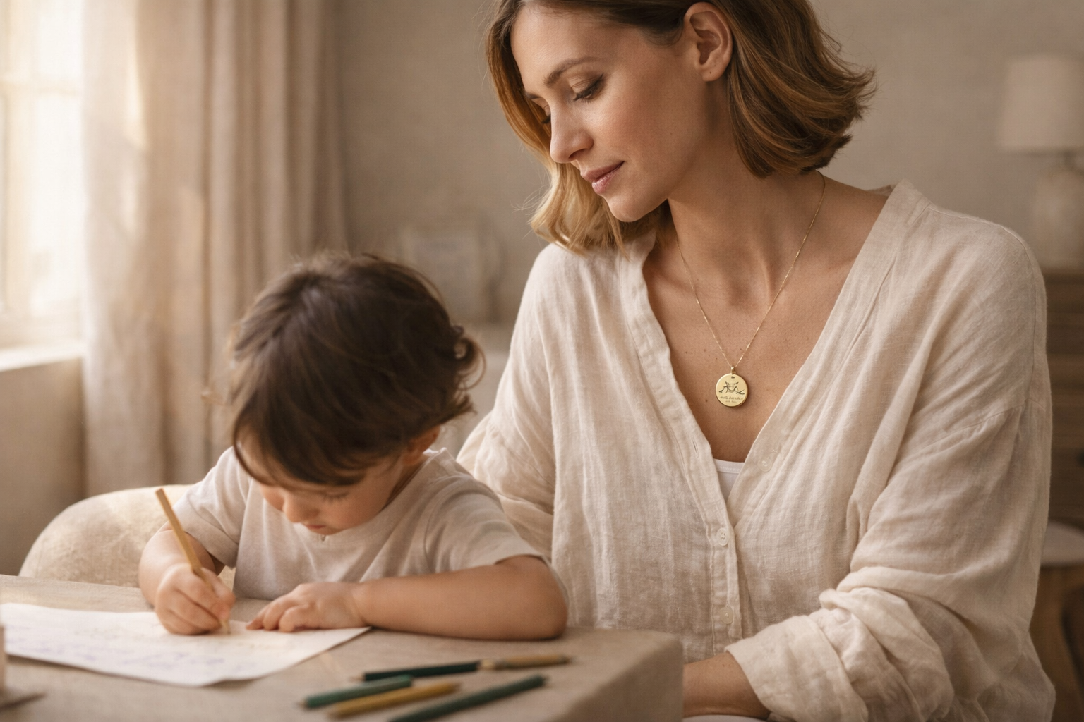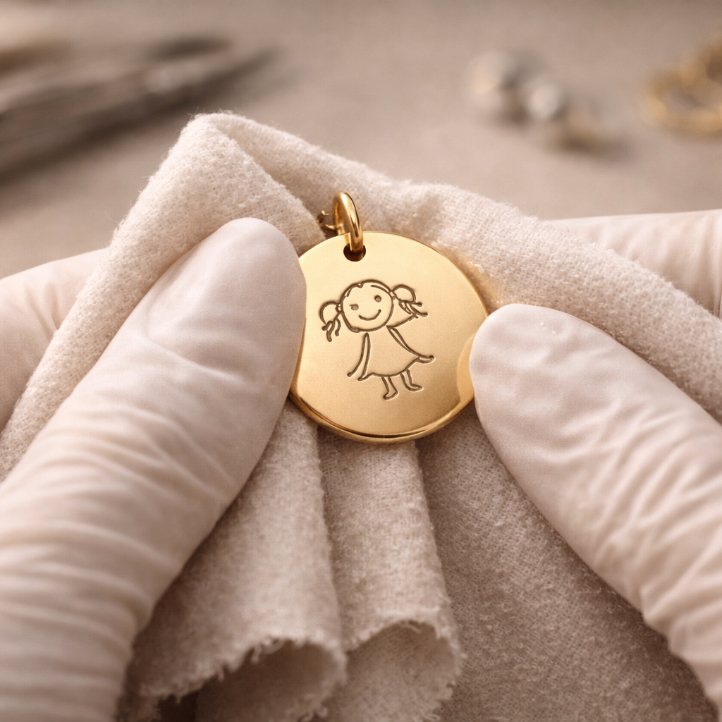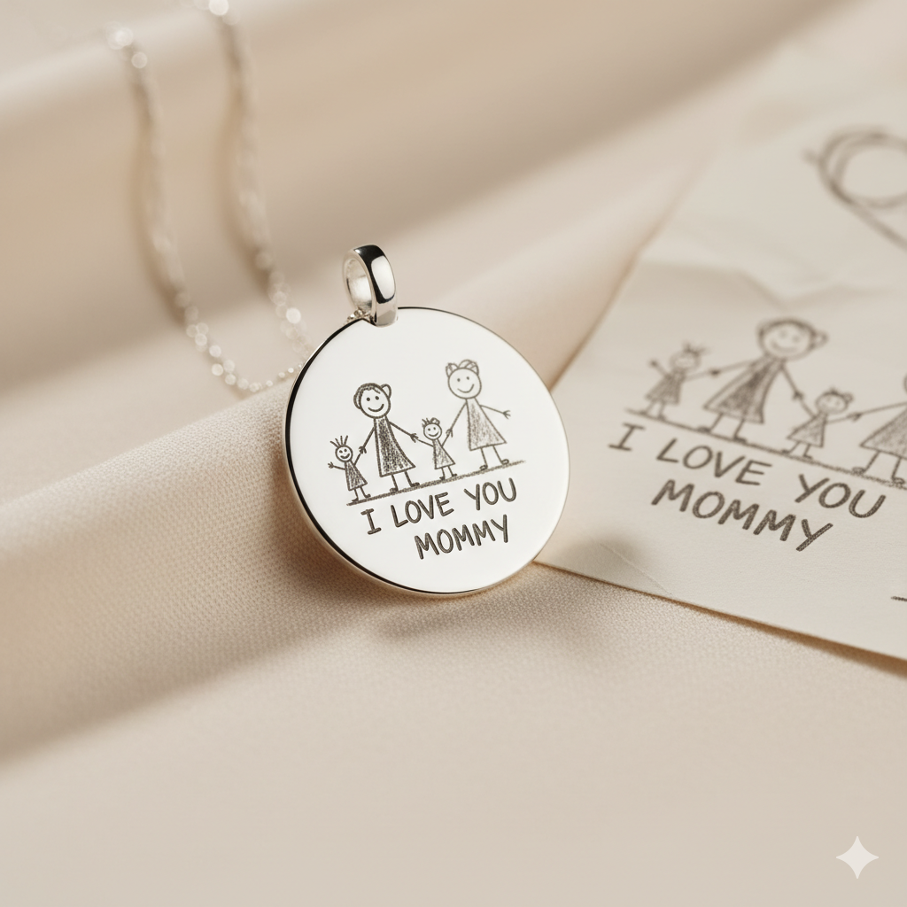 Your child's drawing. Engraved in steel. Worn every day.