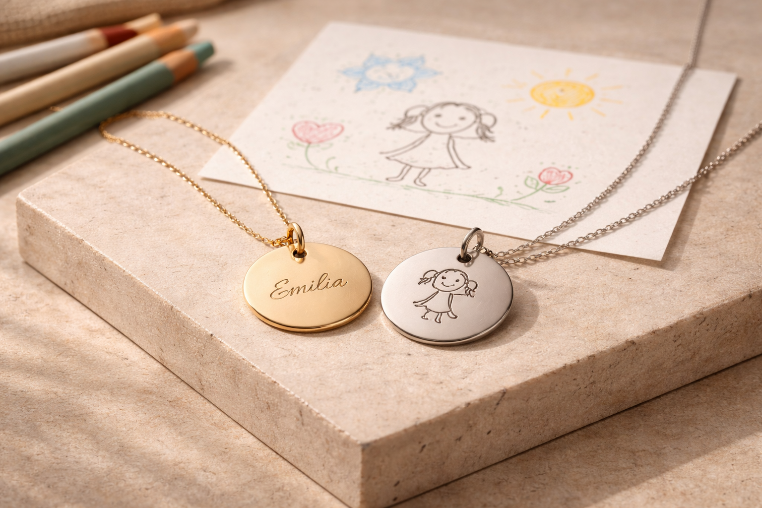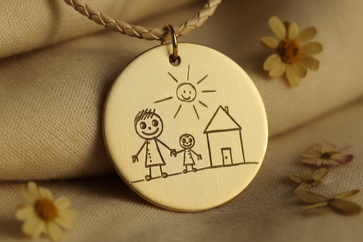 The Inner Ziva Heirloom Disc™ transforms your child’s artwork into a fine-line engraved piece designed to move with you — from school drop-off to the boardroom.